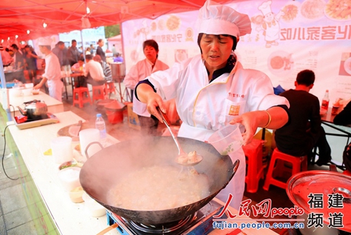 ??? “松丸子”是寧化的特色小吃,用豆腐、香菇丁、荸薺丁等制成。在當(dāng)?shù)赜谐粤怂赏枳樱徽贻p輕松松的說法 鄒家驊攝