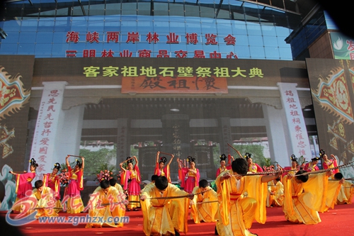 11月8日,三明工貿(mào)學(xué)校48名學(xué)生志愿者亮相林博會(huì),參加行三通鼓、傀面舞、獻(xiàn)花籃、行上香禮、行奠酒禮及祭祀舞等祭祖大典儀式表演,與廣大觀眾一起緬懷先人恩德,共同傳承客家文化。《祭祀樂舞》是中國古代帝王祭祀、朝賀、宴享等大典的專用樂舞,中正和平,典雅純正,被奉為最高的禮儀典范。(賴全平 攝)