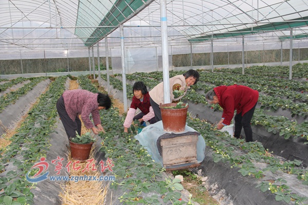石壁現代農業觀光園種植的草莓以奶香(紅顏)草莓為主,由于不施農藥化肥,采用滴灌均衡水份,色亮個大,口感好,營養豐富,每到采摘時節,草莓就供不應求。2014年石壁草莓種植由往年的二三十畝增加到150畝,目前已陸續進入盛花和結果期。據觀光園負責人介紹,適當剪掉一些密集的花蕾,能減輕同枝花蕾對養分的爭奪,提高坐果率和漿果的質量,確保草莓優質高產。在草莓種植大棚里專門放養了10多箱蜜蜂,8萬多只飛舞的蜜蜂能幫助草莓授粉,讓草莓異花授粉均勻,坐果率高,果實飽滿且成熟期集中,上市銷售提前。