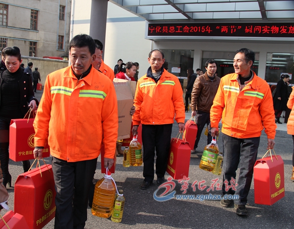 ??? 2月6日,寧化縣總工會舉行“兩節”慰問實物發放儀式,工作人員將慰問的油、大禮包等年貨送到107名困難職工、60名農民工的手中。上圖為職工們高興地將年貨提回家。