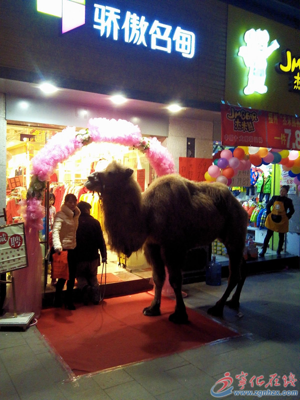 ??? 2月5日晚上8時許,寧化縣城區(qū)南大街的步行街內(nèi)燈火輝煌,人潮涌動。在絡(luò)繹不絕的行人中,一名衣衫不整的中年男子竟?fàn)恐活^瘦骨嶙峋的駱駝,沿著街道挨家挨戶向店主乞討,過往市民紛紛停下拍照、圍觀。