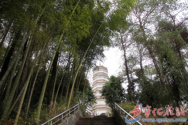 ??? 寶塔底層塑有一尊燙金的神像,供游人燒香朝拜和祈福。沿著塔內(nèi)迂回的樓梯,可直達(dá)塔頂。登高遠(yuǎn)眺,猶如置身于云彩間,只見山下車水馬龍、高樓林立,古老的山城正煥發(fā)出勃勃生機。