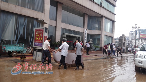 圖為20日上午,縣直機(jī)關(guān)工作人員清掃洪災(zāi)過后的大街(張麗勍/攝)