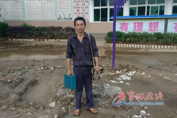 ??? 校園全是厚厚的淤泥,學校出動兩臺抽水機抽水清洗。他冒著瓢潑大雨到河邊安裝抽水機,搬起100米的輸水膠管在厚厚的淤泥中艱難奔波。在安裝第二臺抽水機時,他準備將輸水膠管翻越圍墻進行架設,站在圍墻下卻拖不動,他搬來“人”字梯爬上圍墻,想下去把墻外卡住膠管的雜物進行清理。雨天梯滑,“人”字梯一滑,他連人帶梯從三米高的圍墻上摔下來,梯子重重地圧在身上……當他緩過神來時,立刻從地上爬起來,重新架梯、上梯,越過墻頭清理雜物,一瘸一拐地走向河邊,順利地把輸水膠管架設完成,跟著老師們一起開展清淤作業……
