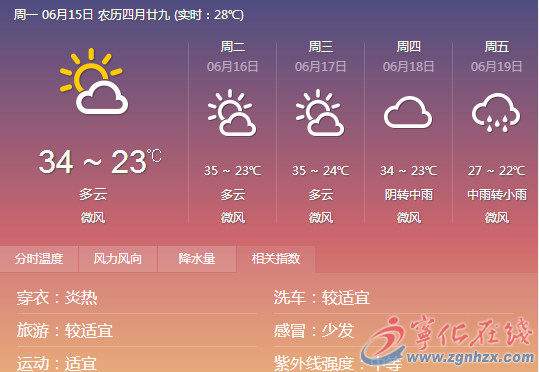 具體預報,29日:多云到晴,氣溫26~35℃;30日:晴到多云,氣溫26~36℃;7月1日:多云,部分鄉鎮有陣雨或雷陣雨,氣溫26~36℃;2日:陰有小到中雨,局部大雨,氣溫25~34℃;3日:陰有小到中雨,局部大雨,氣溫25~32℃;4日:陰有小雨,氣溫25~32℃;5日:多云到陰,有陣雨或雷陣雨,氣溫25~36℃。(羅 鳴)