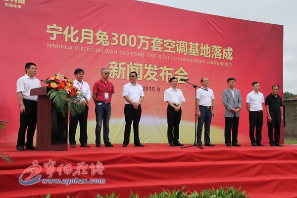 ??? 當天,寧化月兔科技有限公司舉行300萬套空調基地落成新聞發布會。三明市委常委、常務副市長朱昌賢,寧化縣委書記肖長根、縣長余建地,市縣有關部門負責人等,寧化月兔科技有限公司董事長史泉、總裁王強,及來自各地的800多名經銷商參加新聞發布會。