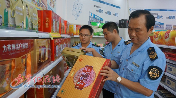 ??? 中秋節臨近,工作人員提醒廣大消費者,購買月餅時要注意查看月餅的生產日期和保質期,仔細觀察月餅外包裝是否完好,是否存在霉變、有異味的現象。同時要保留好購物憑證,以便出現問題時保護自己的合法權益。圖為寧化縣市場監督管理局工作人員檢查在售月餅。(陳根財 廖銘興)