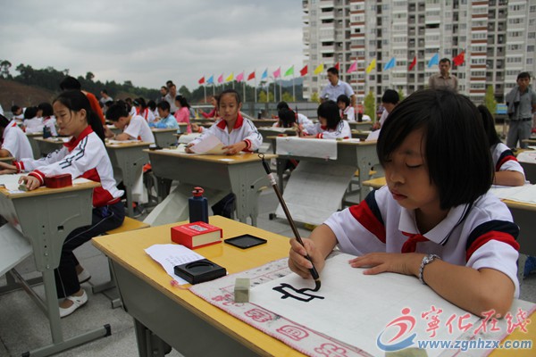 ??? 9月29日,寧化縣“弘揚客家文化,傳承蘇區精神”青少年兒童現場書法大賽在縣世界客屬文化交流中心舉行。來自該縣各中小學的100名學生參加了比賽。