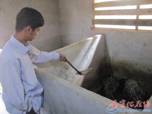 2005年4月,在縣殘聯和鄉計生辦的幫助下,雷紹先籌資12萬元,前往交通便利的曹坊鎮曹昇村,建起一座占地3000平方米的養殖基地。雷紹先通過光碟和書籍自學養殖技術,并向當地養殖大戶虛心請教,不斷摸索經驗,有時甚至吃住都在豬場里。獨手養豪豬,相當費時費力,他多次被鋒利的箭刺擊傷,依然樂在其中。