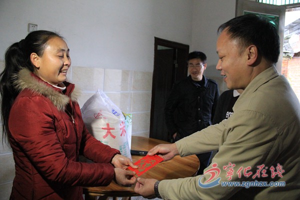 巫坊村獨男戶張玉妹接過慰問金,感動得熱淚盈眶