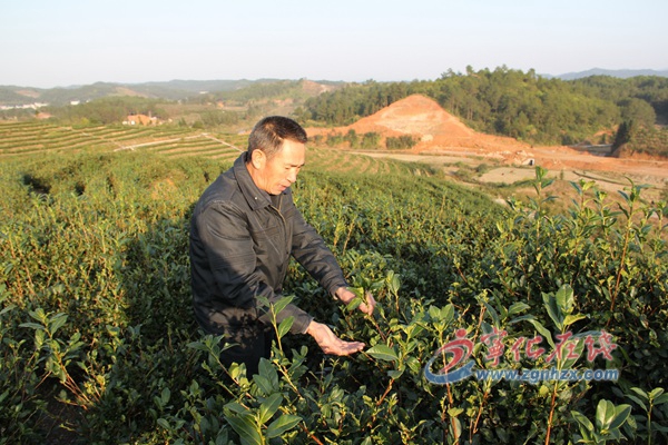 茶農張老才在察看茶樹長勢