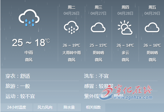 具體預(yù)報(bào),4月26日:中到大雨,部分鄉(xiāng)鎮(zhèn)大到暴雨20-27℃;4月27日:中到大雨轉(zhuǎn)小雨,部分鄉(xiāng)鎮(zhèn)大到暴雨 19-25℃;4月28日:多云到晴 15-25℃;4月29日:晴 14-27℃;4月30日:多云轉(zhuǎn)陰有陣雨,部分中雨 16-23℃;5月1~2日:中雨,部分鄉(xiāng)鎮(zhèn)大雨 17-25℃。(羅 鳴 吳鳳珠)