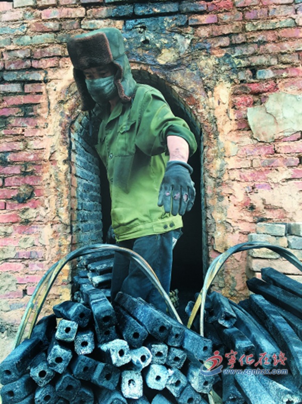 工人正將炭化好的產(chǎn)品從窯中搬出。