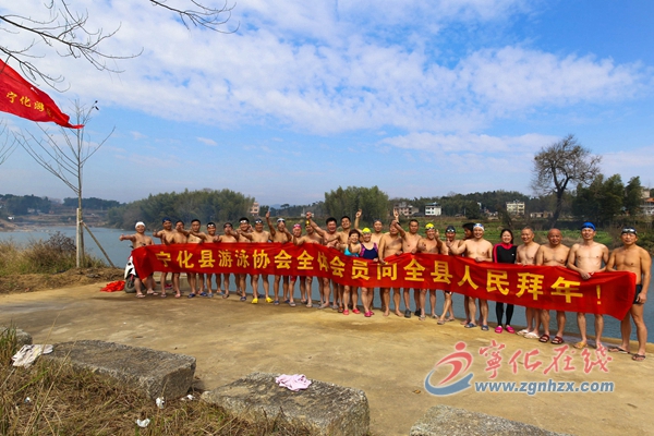 ??? “寧化縣游泳協會全體會員向全縣人民拜年!”上午11時許,在簡短的入水儀式結束后,隨著一聲令下,冬泳健兒陸續躍入冰冷的河水中,河面上人頭攢動,你追我趕。河岸邊親友紛紛拍照留戀,為冬泳隊員們吶喊加油。(張麗勍)