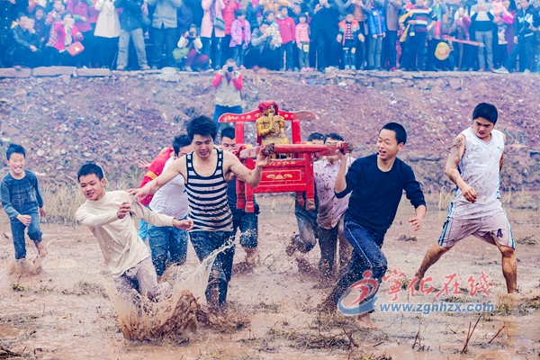 ??? “恭請‘五谷神’下田!”11時50分,隨著一聲悠長的吆喝聲,頓時鞭炮轟鳴,禮花騰空而起,四名漢子抬著“五谷神”菩薩跳入一口方形的水田,順著鼓點在水田里飛奔。30名漢子隨后紛紛跳下水田,迅速抓起田里的稀泥互相對砸,甚至在泥地里摔跤打斗,田里歡聲笑語一片。很快,田里的漢子已成“泥人”。隨著鼓聲,漢子們紛紛追趕著抬菩薩的人,見有人摔倒了,旁邊的人迅速上前接力,抬起菩薩繼續狂奔不已,累了就在田埂上坐著休息一會。十幾個回合以后,村中長老見“泥人”都已精疲力竭,便讓大家將“五谷神”抬上岸,清水沖洗后,重歸祖祠。