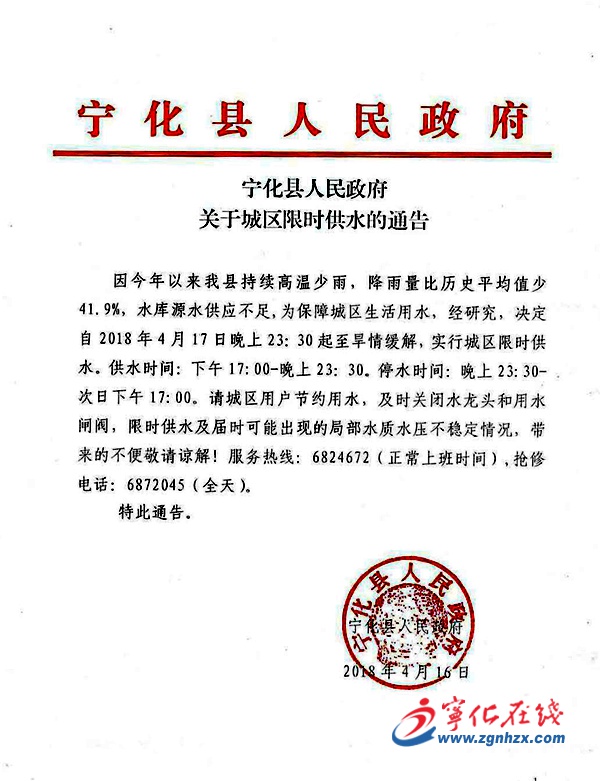因今年以來,寧化縣持續高溫少雨,降雨量比歷史平均值少41.9%,水庫源水供應不足。為保障城區生活用水,自2018年4月17日晚上23:30起至旱情緩解,實行城區限時供水。供水時間:下午17:00至晚上23:30。停水時間:晚上23:30至次日下午17:00。