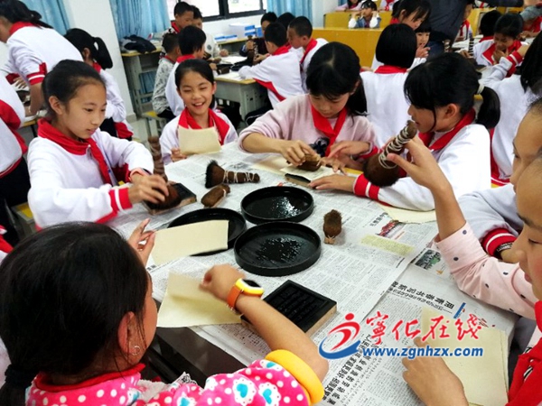 ? ? 在木活字體驗課堂上,客家木活字技師邱恒勇、巫松根向師生介紹了木活字的歷史淵源、印刷道具、印刻工藝等知識,現(xiàn)場演示印刷流程,精心指導(dǎo)他們學(xué)習(xí)印刷。固版、刷墨、覆紙、刷印、晾曬……在師傅們的指導(dǎo)下,學(xué)生二人一組,互相合作,在雕刻著唐詩宋詞的木活字模版上學(xué)習(xí)印刷,一張張充滿墨香的小紙片印好了,越印越清晰,越印越規(guī)范,同學(xué)們捧在手心如獲至寶。