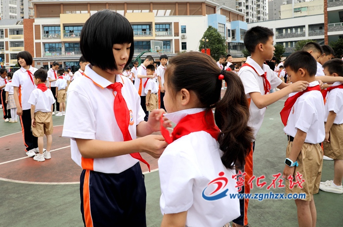 ? ? 寬闊的操場上,參加活動的學生整齊列隊,充滿朝氣與活力。升旗儀式過后,師生同唱《國歌》《中國少年先鋒隊隊歌》。二實小少先隊大隊輔導員孫瀾芳宣讀了關于組建一年級中隊的決定,宣布一年級新隊員名單,決定批準全校545名新同學正式加入中國少年先鋒隊,并為新建的中隊授中隊旗。五年級的隊員們為一年級小朋友系上鮮艷的紅領巾,并互敬隊禮。校長余洪慶為每個中隊聘請中隊輔導員,向新入隊的少先隊員們表示祝賀。