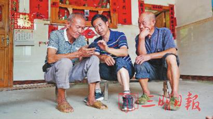 曾繁益的兒子曾祥玉(右一)、女婿謝序鰲(左一)正在瀏覽手機里的“記者再走長征路”報道。