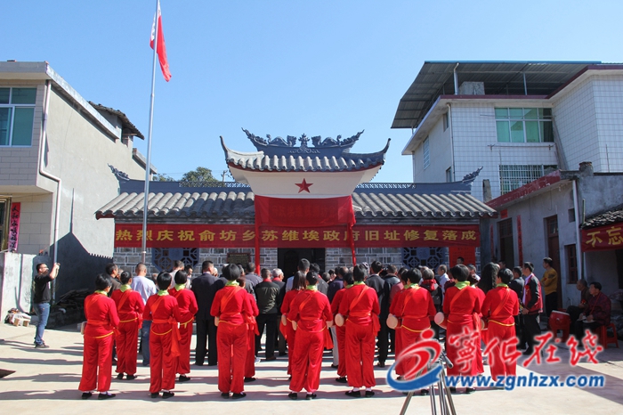 在鑼鼓和鞭炮聲中,安樂鎮(zhèn)相關負責人和劉坊村俞氏宗親共同為俞坊鄉(xiāng)蘇維埃政府舊址揭牌。