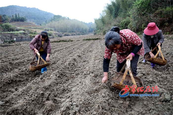 3月11日,寧化縣安遠鎮硝坊村200畝的種植基地上,村民正在翻土起壟,搶晴種植檳榔芋。
