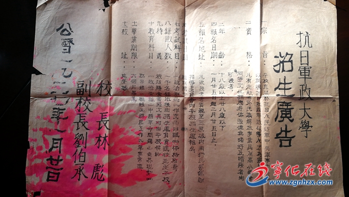 這張招生廣告采用宣紙手書,盡管有八十多年的歷史,但保存相對比較完好。廣告上“中國抗日軍政大學公章”清晰可辨,手寫者在整個寫作過程中分別使用了仿宋體,隸書,楷書三種字體寫作,字跡工整,內(nèi)容保存完好清晰。