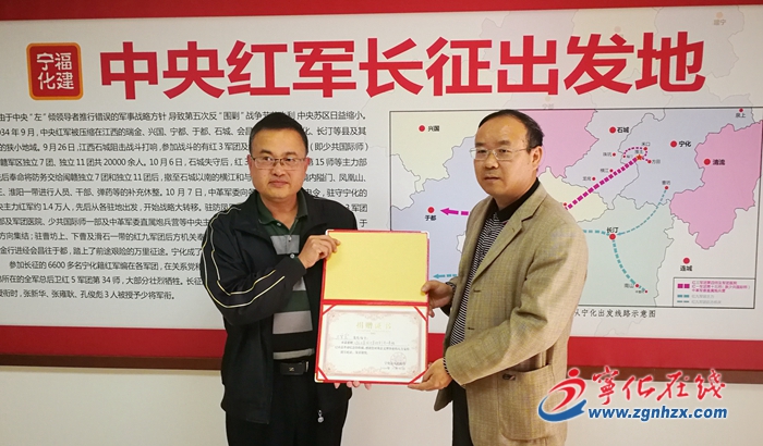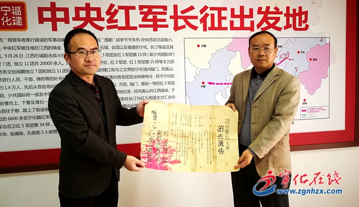 近日,市民王官金向?qū)幓h紅軍長征出發(fā)地文物保護中心捐贈抗戰(zhàn)時期抗日軍政大學招生廣告歷史文物。