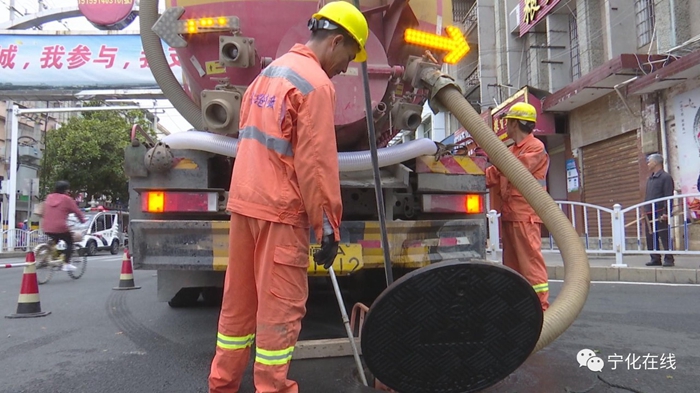 11月23日,在寧化縣北大街,市政工作人員正在將高壓水槍放到地下管道,清洗下水管道和井室。