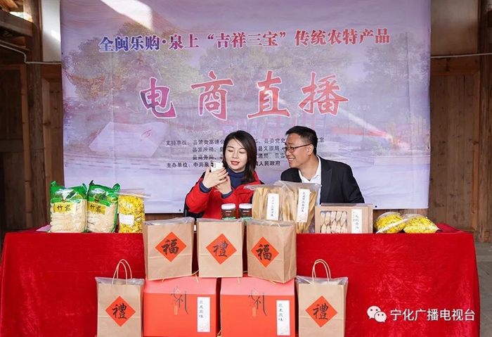 外邊廣場上是熱鬧的歌舞演出,里邊紀念館左側戲臺搭建的直播間里,泉上“吉祥三寶”傳統農特產品電商直播也在進行著。泉上鎮和縣融媒體中心的工作人員向直播間里的觀眾們逐一推介泉上豆腐皮、孔坑貢茶、竹蓀、姬松茸、土蜂蜜、金絲皇菊茶等本地農特產品。直播吸引了約8000人次的觀看,留言區粉絲們熱情高漲,積極參與互動,取得了良好的傳播效應。