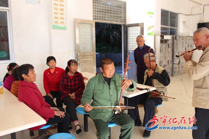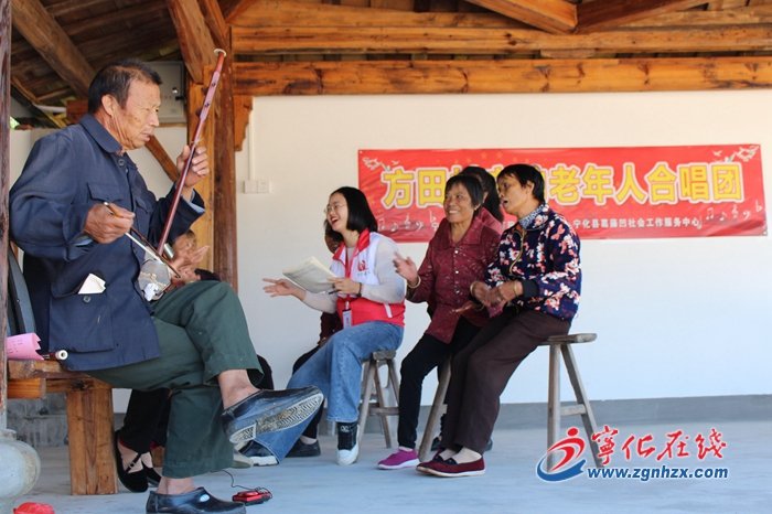 這是一個(gè)由老人們自發(fā)組成的合唱團(tuán),取名寧韻合唱團(tuán),他們正在演唱當(dāng)?shù)乜图疑礁?。每周二上?時(shí),合唱團(tuán)成員和部分村民準(zhǔn)時(shí)來到幸福院,跟隨著節(jié)奏,演唱一曲曲紅歌、山歌。