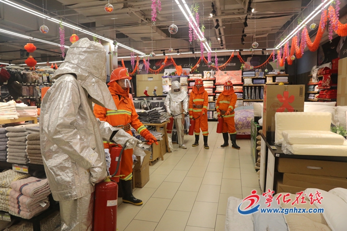 演練模擬寧化縣客家影視院線綜合體一區永輝超市2層床上用品區因電線短路發生火災,火勢迅速蔓延,形成大面積燃燒,呈不可控狀態擴散,并有人員被困,被困人員數量不詳。工作人員立即呼叫商場安保部進行緊急處置,8時30分,安保人員撥打119報警。?