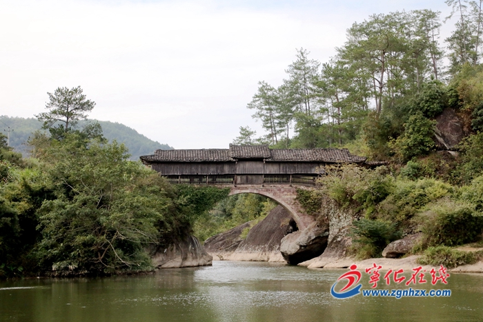 廊橋,又稱屋橋,橋面架廊屋,供行人遮陽避雨,又能保護木結構不受損壞,堪稱珠聯璧合,故而被人們視為“風水橋”。中國廊橋有2000多年的建造歷史,興起于秦漢,繁榮于唐宋,鼎盛于明清。寧化有大小廊橋20多座,水茜鎮堪稱石拱廊橋之鄉,現有廊橋5座,其中,蛟潭橋橫跨在兩岸石壁之間,氣勢最為雄偉。