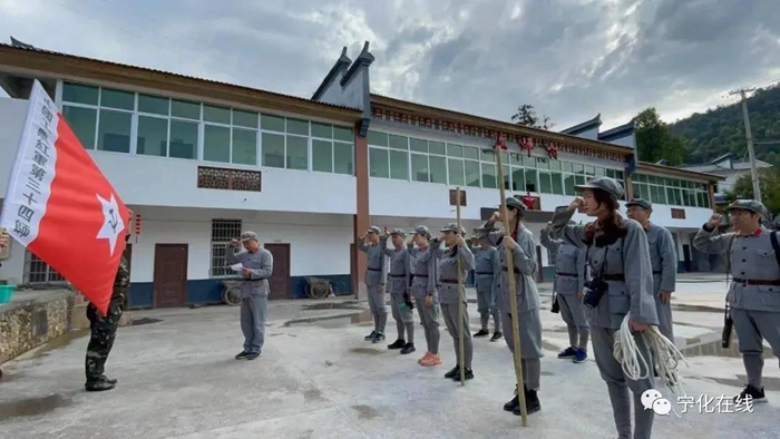 次日,老師們還參加了重走紅軍長征路活動。他們穿上紅軍軍裝、背起槍支、扛著軍旗,沿著山路行進。途中經過陡峭狹窄的古道,遭遇敵軍埋伏,反擊取得勝利,制作擔架救護傷員,最終成功抵達終點。經過為期兩天的體驗之旅,大家都感到精神受到了洗禮。