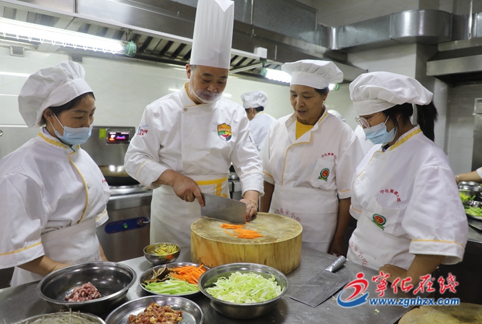 近日,寧化客家小吃第206期免費(fèi)培訓(xùn)班培訓(xùn)現(xiàn)場(chǎng),“中國(guó)烹飪大師”孫福安正在指導(dǎo)28名學(xué)員練習(xí)切菜的刀工,學(xué)習(xí)煮粉皮、炒粉條。