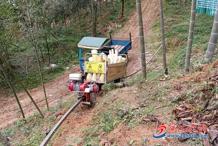 安樂鎮竹山多為陡峭的山體,再加上春筍本身的體積和重量,如何把春筍搬下山成了筍農最頭疼的問題。今年安樂鎮人民政府投資80萬元,修建了5.2公里竹山軌道,有效地解決了竹筍的搬運難題。金鑫筍竹負責人吳育林介紹,“小火車”結構簡單、安裝方便,無需人員跟車操控,占用空間小,不破壞原有地貌,適用于山地運輸。