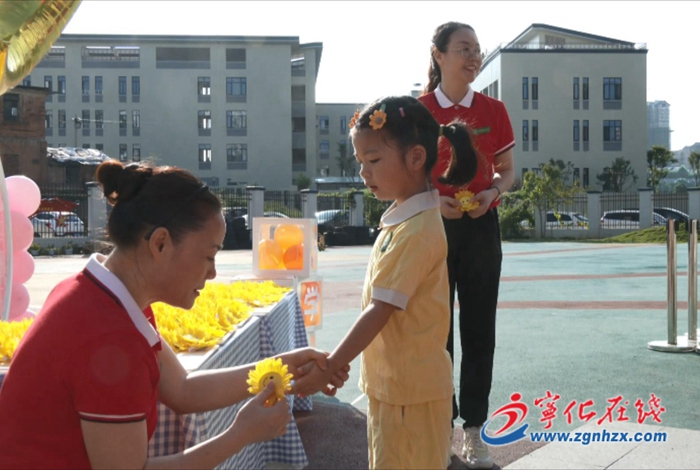 在寧化連岡幼兒園,家長們帶著幼兒入園,園長為入學幼兒佩戴園花——向日葵。升旗儀式后,老師帶著幼兒們進行丟手絹、繪畫、放紙飛機等活動,讓幼兒盡快適應新學期、新環境。