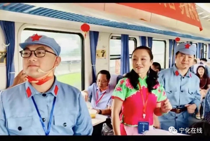 10時30分,列車緩緩進站,寧化縣20余名文化志愿者踏上了首發列車,把寧化客家山歌對唱、客家方言表演唱、紅色歌曲聯唱帶上了火車,為火車首發助興,給乘坐旅客提供“別樣”服務。