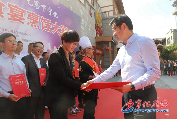 當天上午,寧化客家小吃培訓中心三樓后廚一片忙碌,各鄉鎮美食宴烹飪代表隊現場制作10道菜品,每組8隊同時進行,限時120分鐘。城區酒店隊在各自酒店完成菜品制作,并將參賽作品送至客家小吃培訓中心參評,評分后供展示品鑒。由美食專家、民俗文化專家、現場衛生專家等組成的評委組,按照評分標準,從“色、香、味、形、創意”等方面對各代表隊菜品進行現場亮分,評出“寧味全宴獎”“寧味特色獎”。縣領導王勝文、李平生、周美華、伍秉曲等為獲獎代表隊頒獎,并合影留念。