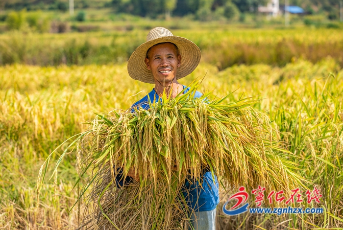 走進寧化縣各田間地頭,空氣里彌散著稻谷的清香,放眼望去,盡是掛滿稻穗的水稻。在田埂上俯視田中,一株株金黃的稻谷低著頭,像一位位害羞的少女,微風拂過,田野卷起金色的浪濤,一望無際的稻田,就像一片金色海洋。遠處的農(nóng)民朋友們正抓緊睛好天氣收割秋糧,稻田里處處洋溢著豐收的喜悅,農(nóng)戶懷抱顆粒飽滿的水稻,滿眼是金秋糧滿倉的豐收美景。