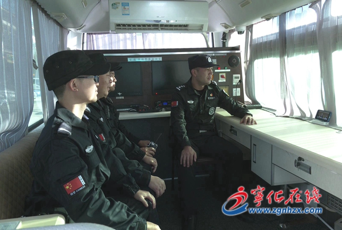 在寧化縣公安局移動警務站內,公安巡特警認真聆聽了黨的二十大報告,備受鼓舞。