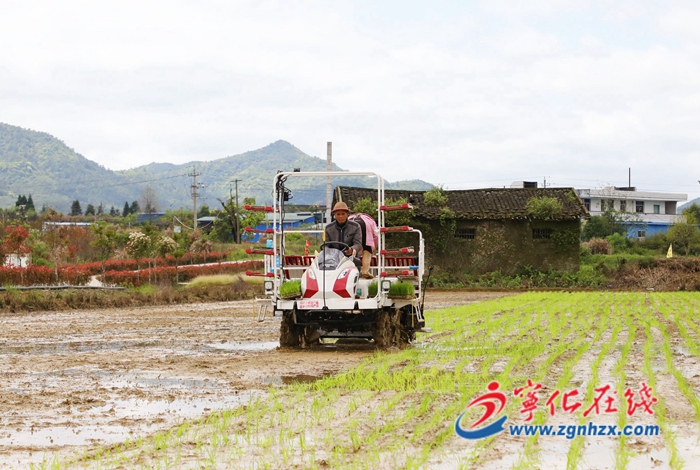 4月7日,在寧化縣湖村鎮龍頭村,好農友家庭農場負責人張旺輝駕駛著高速插秧機在平整好的水田里往返穿梭,一盤盤綠油油的秧苗整齊均勻地植入泥土中。農戶們忙著將大棚里育好的秧苗搬上插秧機及時為機械補苗。