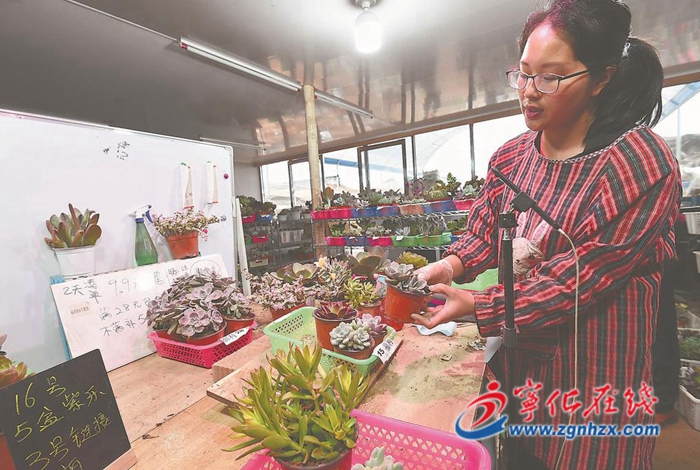 “這是‘藍光’,不愛長稈子不愛爆側芽,像一朵蓮花;這是‘醉美人’,紫粉色,淺淺的紫粉……養多肉要注意多陽少水常通風。”日前,寧化縣安樂鎮謝坊村多肉種植基地大棚內,主播李萍對著手機向網友展示、推銷各種多肉植物。