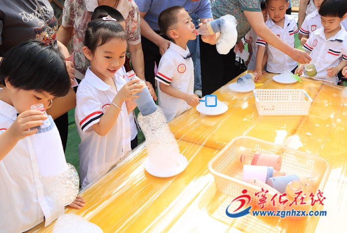 伴隨著歡快的音樂,活動拉開了帷幕。“奇幻泡沫”、“撈魚挑戰”“魔力泡泡”“沙池尋寶”等游戲讓孩子們在大自然中探索、學習;結合繪本開展的親子項目“豬八戒背媳婦”“蒙眼敲鑼”“親子大作戰”等充滿著書香氣;此外,還有充滿客家鄉情味的“童樂自助站”。冰淇淋、爆米花、棉花糖……各種豐富多樣的美食琳瑯滿目,讓孩子們興奮不已,家長和孩子們拿著游園券有序排隊、自主挑選,文明用餐。