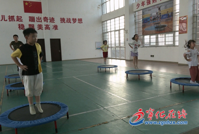 練習(xí)結(jié)束后,孩子們?cè)诶蠋煹闹笇?dǎo)下在蹦床上進(jìn)行叉腰跳、貼臂跳等基本跳,整個(gè)現(xiàn)場(chǎng)沉浸在輕松歡快的氛圍中。