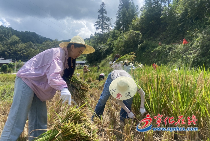 黨課結束后,黨員們走進團市委認領的“責任田”中開展“我在鄉間有畝田”志愿服務活動。大家揮舞著鐮刀,一兜兜金燦燦的稻谷被收割下來有序的排在一邊,形成一幅豐收的畫卷。