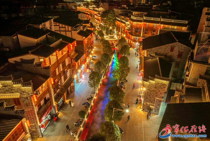 走在寧陽(yáng)古街,可以看到新建的門樓莊嚴(yán)聳立在入口,改造后的房屋歇山頂、馬頭墻、木結(jié)構(gòu)門窗相得益彰,新鋪的石板路干凈整潔,古街中央溪水穿流而過(guò),水聲潺潺中,溪岸燈光色彩變幻,與水霧結(jié)合,仿若仙境一般。