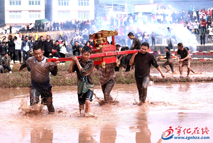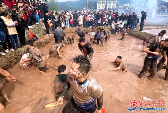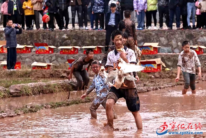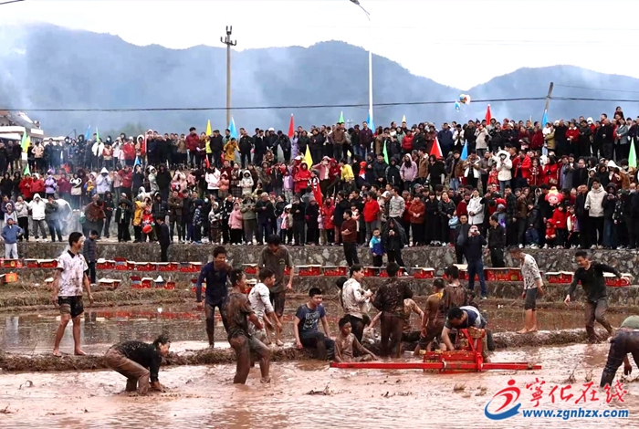 11時左右,“鬧春田”活動開始,四名漢子抬著“五谷神”沖入方形水田,踩著鼓點飛奔,參加活動的村民緊跟著紛紛跳入水田,他們在泥濘中追趕、嬉鬧,抓起田里的稀泥互相對砸,個個都成了泥人。隨后水田內又舉行了摸魚、抓鴨等精彩活動?!拔沂锹犈笥颜f今天這邊有鬧春田的活動,于是帶上家人一起來到這邊,現場感覺十分震撼!在這種熱鬧氣氛中也讓我們體會到了不同的民俗文化?!贝迕駨埱镌春退募胰吮硎久髂暌欢ㄒ賮?。