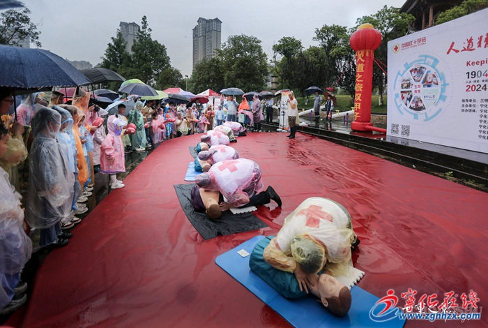 活動現場,共組織7名紅十字救護師資開展“救在身邊+生命教育”行動,為親子家庭現場演練心肺復蘇應急救護技能,并指導家長孩子學習操作。擺放了心肺復蘇操作流程、氣道異物梗阻操作方法、紅十字“三獻”工作、紅十字志愿服務等宣傳展架,發(fā)放“人人學急救,急救為人人”宣傳冊300余份。賦欣幼兒園120名小朋友還為現場觀眾表演“春夜喜雨”節(jié)目,并組織親子家庭在背景墻上打卡簽字、拍照留念宣傳。