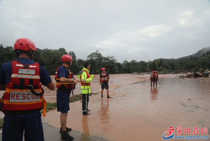 正駐守在安遠鎮的寧化縣消防救援大隊接到報警后,立即出動搶險救援車和消防官兵前往救援。消防官兵到達現場時,水流湍急,通村道路被淹,在離岸十多米的河中央,一輛鏟車被淹沒一半,司機站在車上。