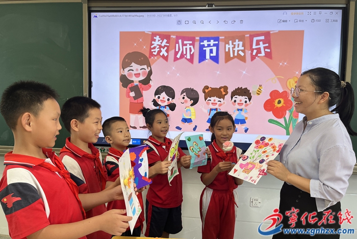 9月10日,寧化縣城南小學開展教師節主題隊日活動,孩子們紛紛將自己精心制作的手工賀卡送給老師,感恩老師的無私奉獻,表達自己對老師最真摯的祝福。此外,學校表彰了年度優秀教師,并向每一名教師送上鮮花和書籍,祝老師們節日快樂。(記者 賴全平 通訊員 邱麗英)